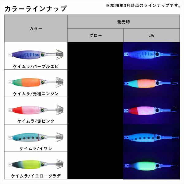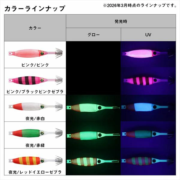 ケイムラ/パープル, ケイムラ/元祖ニンジン, ケイムラ/イエローグラデ, ピンク/ブラックピンクゼブラ, 夜行/赤緑, 夜行/レッドイエローゼブラ