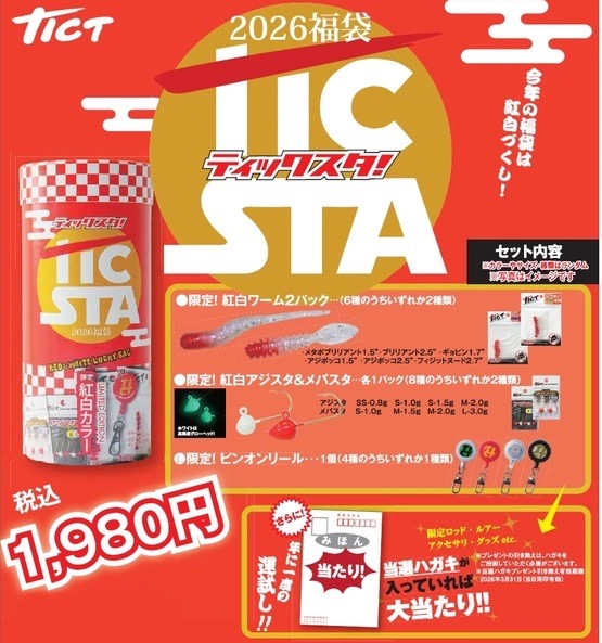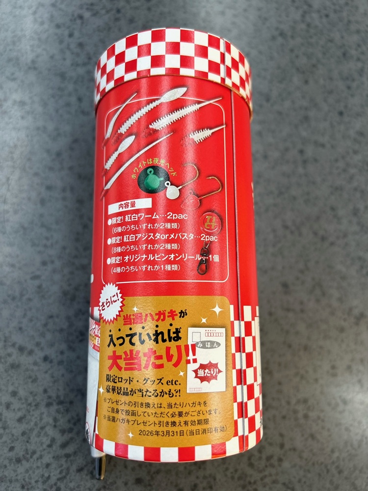 紅白ワーム2パックに紅白ヘッドカラーのアジスタ&メバスタ、そして限定ピンオンリールの入ったお得な福袋!